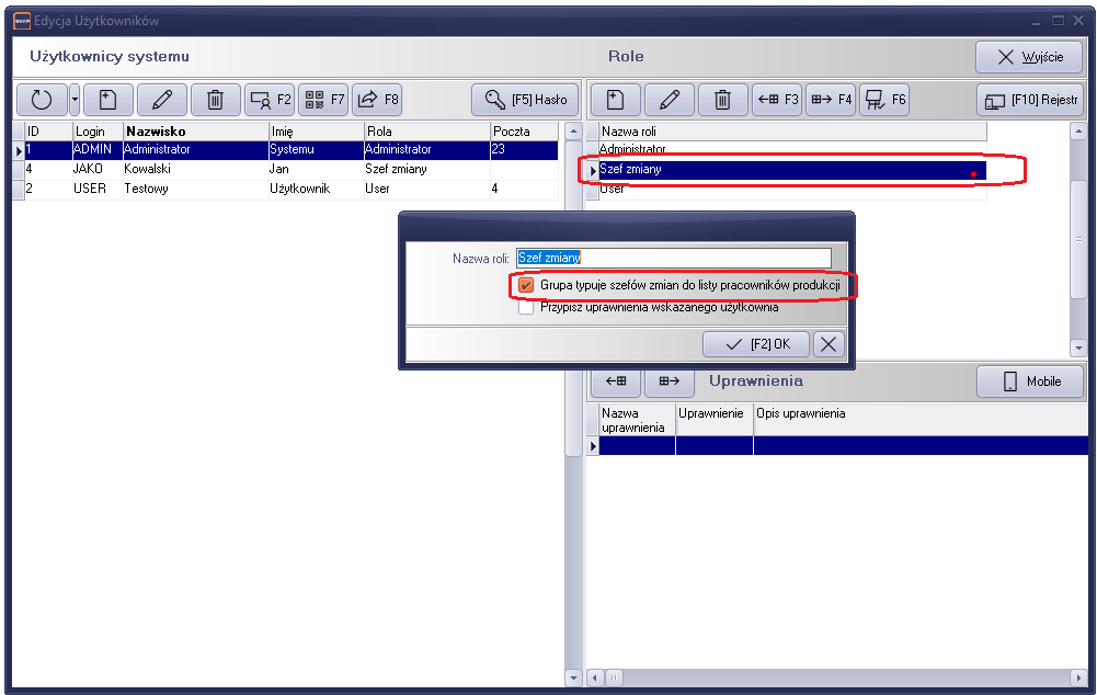 W sekcji „Role”, definiujemy role uprawnień z operatorami jako szefowie zmiany. W tym celu w edycji roli zaznaczamy znacznik „Grupa typuje szefów zmiany do listy pracowników produkcji”.