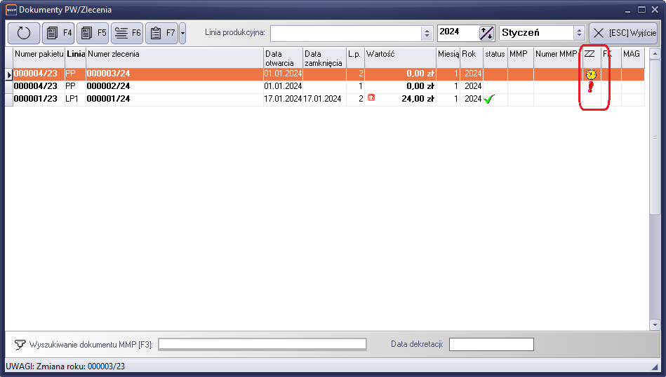 W oknie listy zleceń produkcyjnych, w kolumnie „ZZ” znajdziemy informację o statusie realizacji rozliczenia zlecenia. W kolumnie mogą wystąpić cztery stany realizacji rozliczenia.