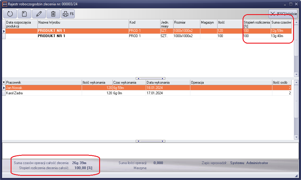 Po wprowadzeniu zapisu w oknie rejestru automatycznie uzyskamy informację o poziomie rozliczenia danej pozycji zlecenia produkcyjnego. W Kolumnie „Stopień rozliczenia”, widzimy procentowy stopień rozliczenia pozycji. W kolumnie suma czasów mamy przedstawioną sumę czasów wprowadzonych zapisów dla danej pozycji. W stopce okna przedstawiono zapisy stopnia rozliczenia zlecenia i sumę czasów dla całego zlecenia produkcyjnego.