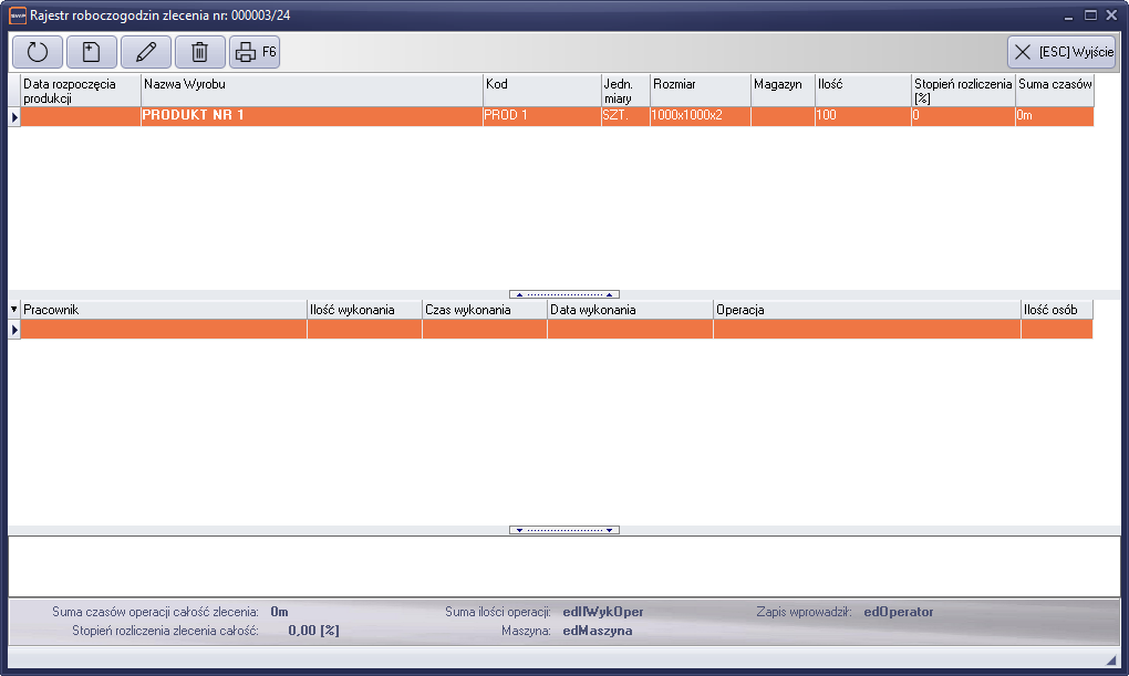 W oknie rejestru widoczny jest ekran podzielony na dwie sekcje. Sekcja górna zawiera listę pozycji zlecenia produkcyjnego. W sekcji dolnej pojawią się zapisy czasu pracy, dotyczące pozycji zlecenia produkcyjnego z górnej części okna.