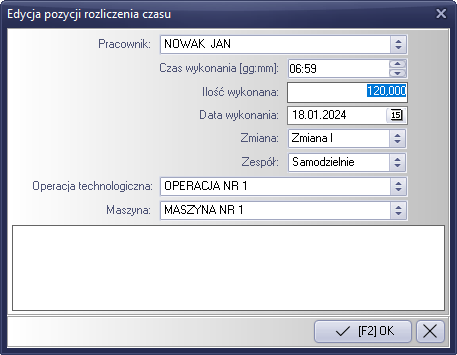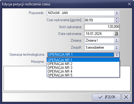 Rysunek 794 Uzupełnienie pól czasu pracy, ilości wykonanych, daty wykonania operacji i ilości osób.