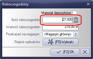 Zostanie również automatycznie przeliczona wartość roboczogodzin, zgodnie ze zdefiniowaną stawką.