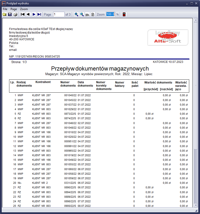 Zestawienie przedstawia przepływ dokumentów w zadanym miesiącu obrotowym, gdzie przepływ może dotyczyć magazynu surowców lub magazynu handlowego jak również każdego zdefiniowanego pod-magazynu. Zestawienie ułożone jest chronologicznie wg czasu wystąpienia zdarzenia.