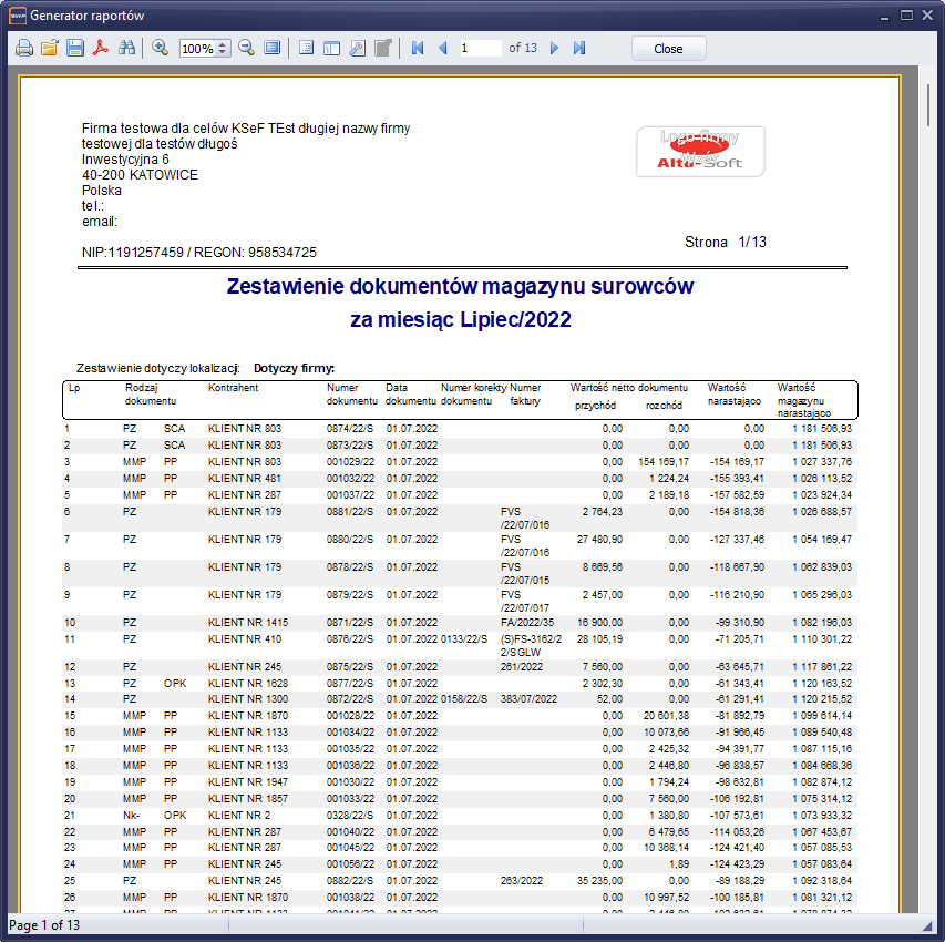 Szczegółowa analiza operacji magazynowych. Wszystkie operacje ustawione chronologicznie w zakresie miesiąca obrotowego. Dodatkowo z wydruku możemy wyczytać stan magazynowy na dany dzień. W zestawieniu zawarte są oprócz numerów dokumentów magazynowych, również numery faktur oraz korekt.