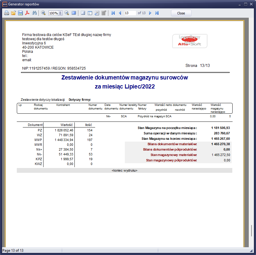 W końcowej części zestawienia otrzymujemy tabelę z wartościami sumarycznymi z cały miesiąc w rozbiciu na poszczególne operacje magazynowe.