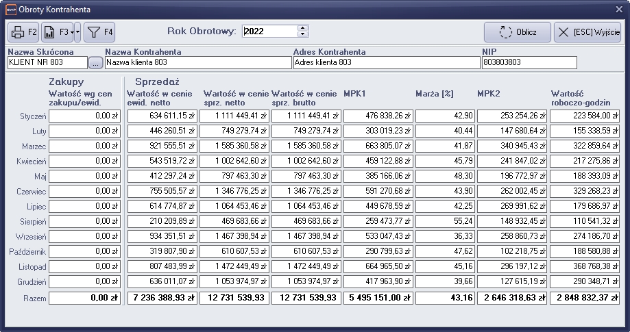 Zestawienie pokazujące obroty z wybranym kontrahentem. Zestawienie zawiera, zarówno informacje o zakupach jak i sprzedaży, jeśli kontrahent jest jednocześnie dostawcą i odbiorcą. Aby wyświetlić informacje, należy wybrać interesujący nas rok obrotowy i wybrać odpowiedniego kontrahenta, przy pomocy klawisz po prawej stronie pola „Nazwa skrócona”.