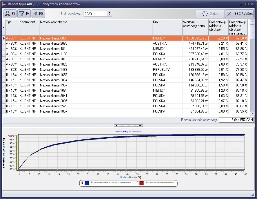 Klasyczny raport ABC obrotów kontrahentów. Raport pokazuje jacy kontrahenci składają się odpowiednio na 80%,15%,5% całkowitego obrotu firmy.