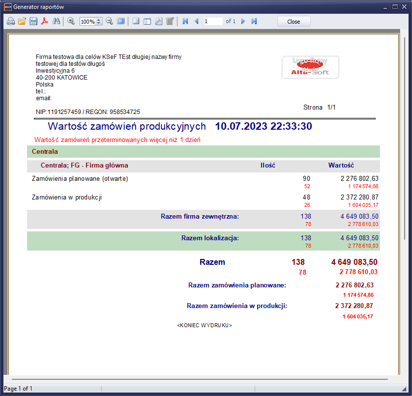 Raport przedstawia wartości planowanej produkcji oraz wartości produkcji w toku. Raport podzielony został na poszczególne oddziały zdefiniowane w firmie