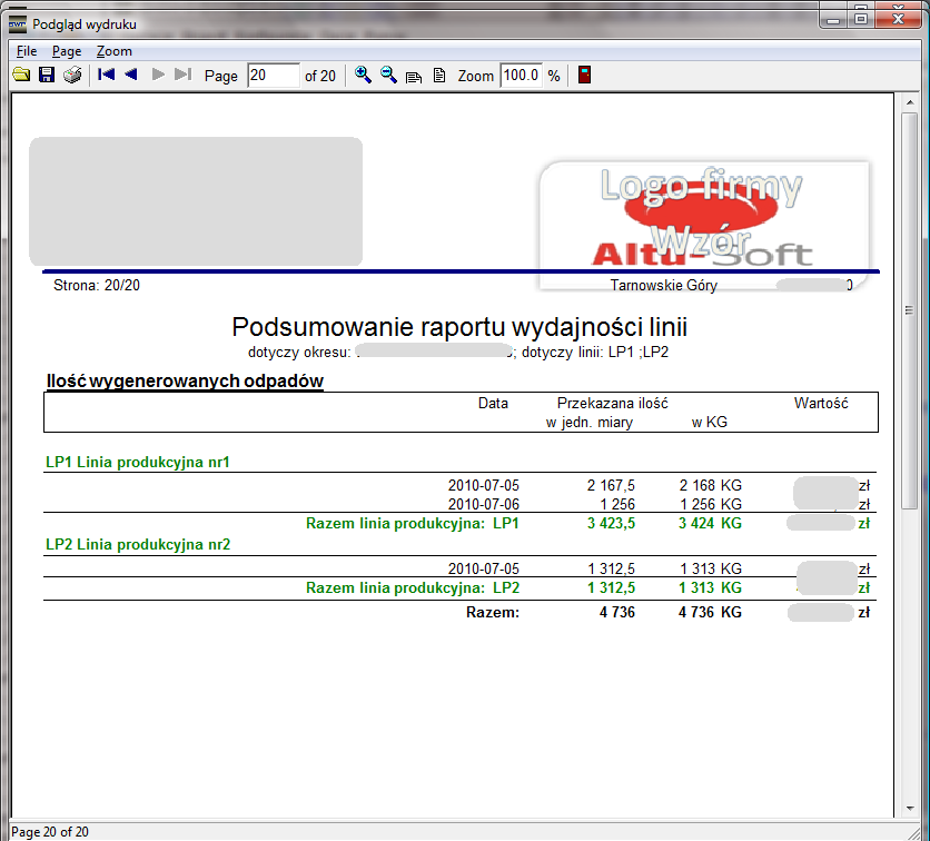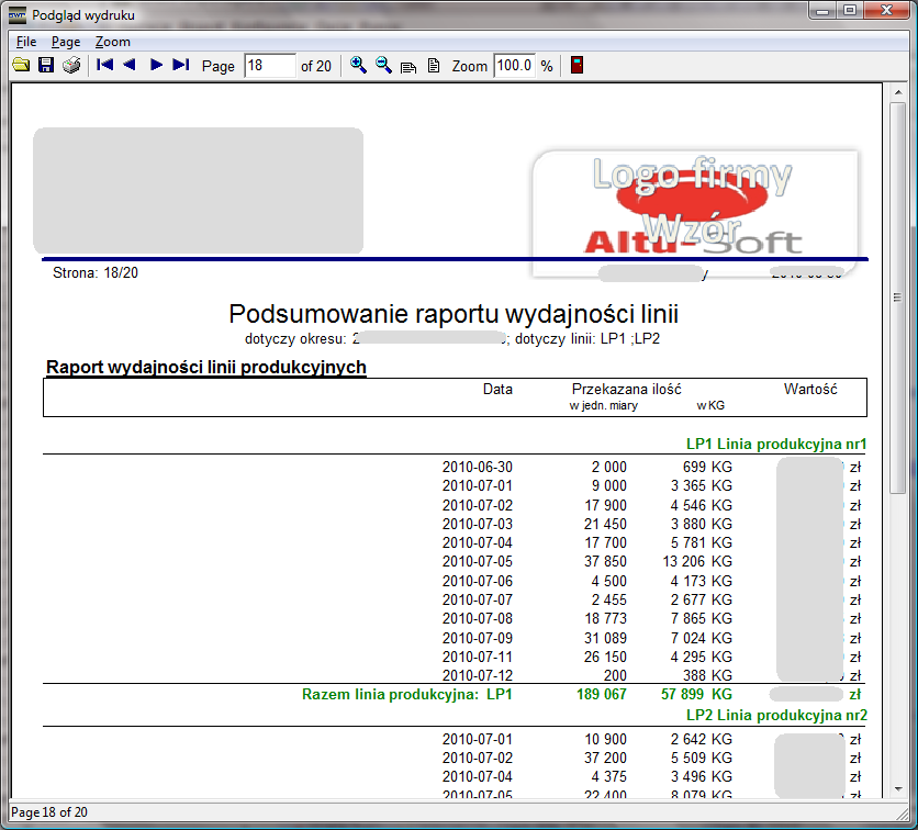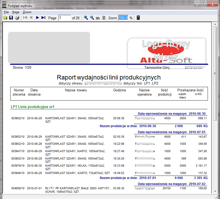- "Raport wydajności linii produkcyjnych". Raport przedstawia w podziale na linie i dni, przekazaną na magazyn ilość produktów gotowych. W rejestrze widoczny jest data, czas przekazania oraz osoba odpowiedzialna.