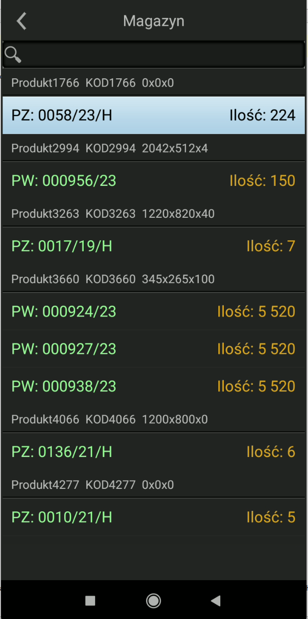 W górnej części ekranu znajduje się pole wyszukiwanie. Wprowadzając dowolny fragment poszukiwanej pozycji magazynowe, nazwy towaru, rozmiaru lub numeru dokumentu, możemy wykonać odfiltrowania pozycji wg zadanego wzorca. Po wprowadzeniu wzorca, w celu zainicjowania działania, należy stuknąć w listę pozycji magazynowych.