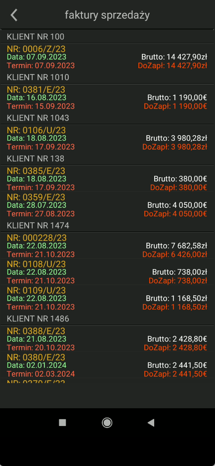 Poprzez stuknięcie na wartość zobowiązań lub należności, otwieramy odpowiednio listę faktur zakupu lub sprzedaży. Lista zawiera informacje o terminach zapłaty i wielkości zapłaty do realizacji.